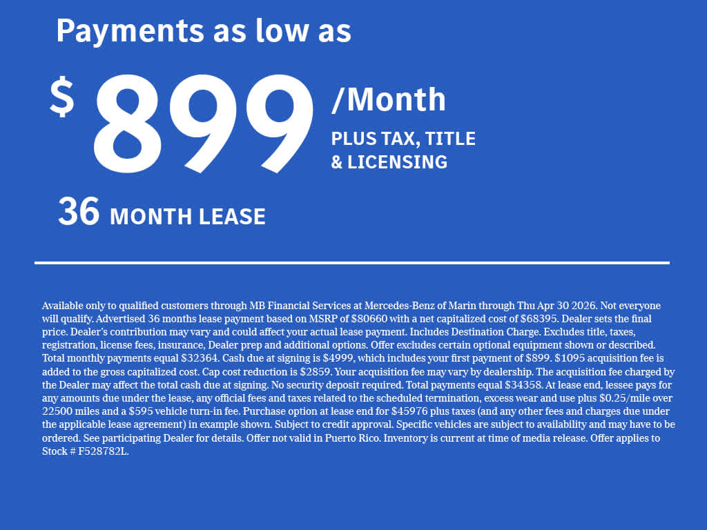 WHEELS: 9.5J X 21 FR & 10.0J X 21 RR MATTE BLACK AMG® Y-spoke, Tires: 265/40R21 Front & 295/35R21 Rear, ACTIVE DISTANCE ASSIST DISTRONIC®, VENTILATED FRONT SEATS, Navigation, Sunroof, Panoramic Roof, Full-Time 4MATIC® All-Wheel, Power Liftgate Looking For A New or Pre-Owned Mercedes-Benz? Look No Further Than Mercedes-Benz Of Marin In San Rafael, California. We Offer A Full Lineup Of New Mercedes-Benz Vehicles. Our Knowledgeable Mercedes-Benz Of Marin New Car Dealer Staff Is Dedicated And Will Work With You To Put You Behind The Wheel Of The Mercedes-Benz Vehicle You Want, At An Affordable Price. Feel Free To Browse Our Online Inventory, Request More Information About Our Vehicles, Or Set Up A Test Drive With A Sales Associate.