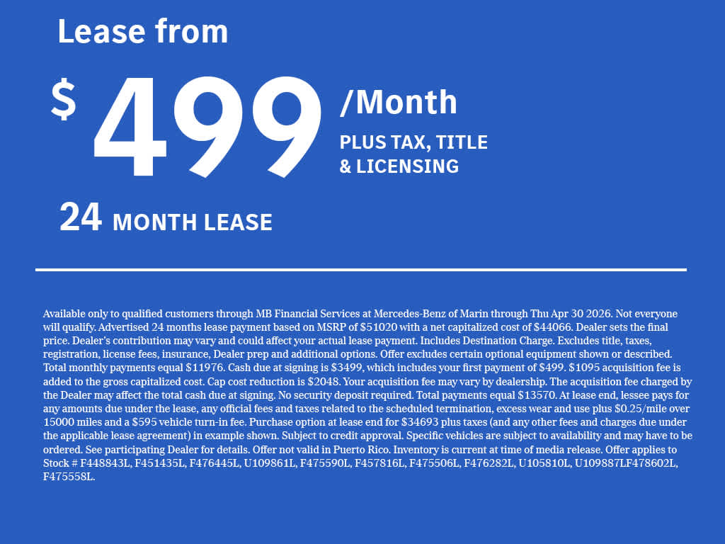 PIANO BLACK LACQUER CENTER CONSOLE, Power Liftgate, Heated Driver Seat, Back-Up Camera, Turbocharged, Satellite Radio Looking For A New or Pre-Owned Mercedes-Benz? Look No Further Than Mercedes-Benz Of Marin In San Rafael, California. We Offer A Full Lineup Of New Mercedes-Benz Vehicles. Our Knowledgeable Mercedes-Benz Of Marin New Car Dealer Staff Is Dedicated And Will Work With You To Put You Behind The Wheel Of The Mercedes-Benz Vehicle You Want, At An Affordable Price. Feel Free To Browse Our Online Inventory, Request More Information About Our Vehicles, Or Set Up A Test Drive With A Sales Associate.
